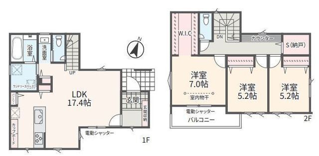 | 部屋 | 1F LDK 17.4帖 、1F 洋 7.0帖 、2F 洋 5.2帖 、2F 洋 5.2帖 |