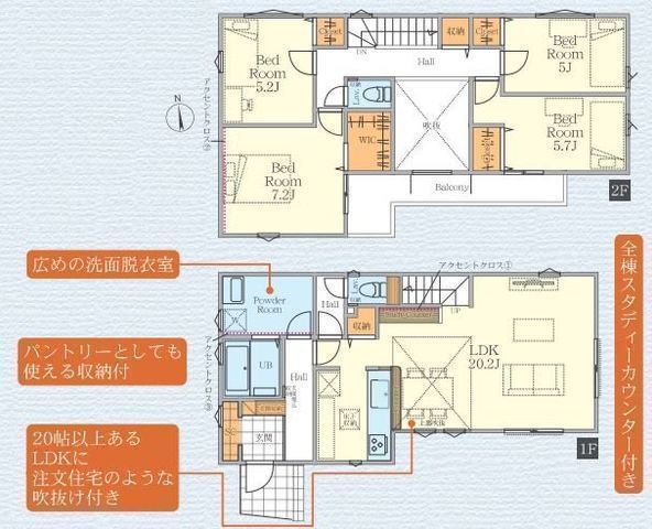 | 部屋 | 1F LDK 20.2帖 、2F 洋 7.2帖 、2F 洋 5.7帖 、2F 洋 5.2帖 、2F 洋 5.0帖 |